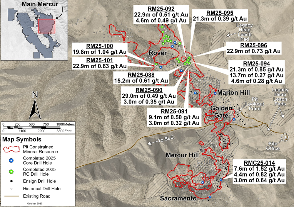 - Assay results have been received for the first nine RC drill holes (RM25-088, 090, 091, 092, 094, 095, 096, 100, and 101) located in the Marion Hill and Rover areas and the first core drill hole (RMC25-014) located in the Mercur Hill area and include: