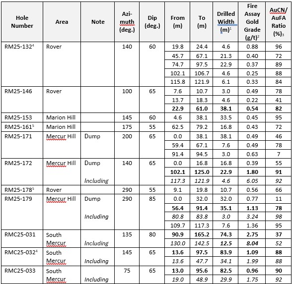 - High grade intercept in RMC25-031 is one of three known ore shoots at South Mercur that are prospective for future exploration at depth.